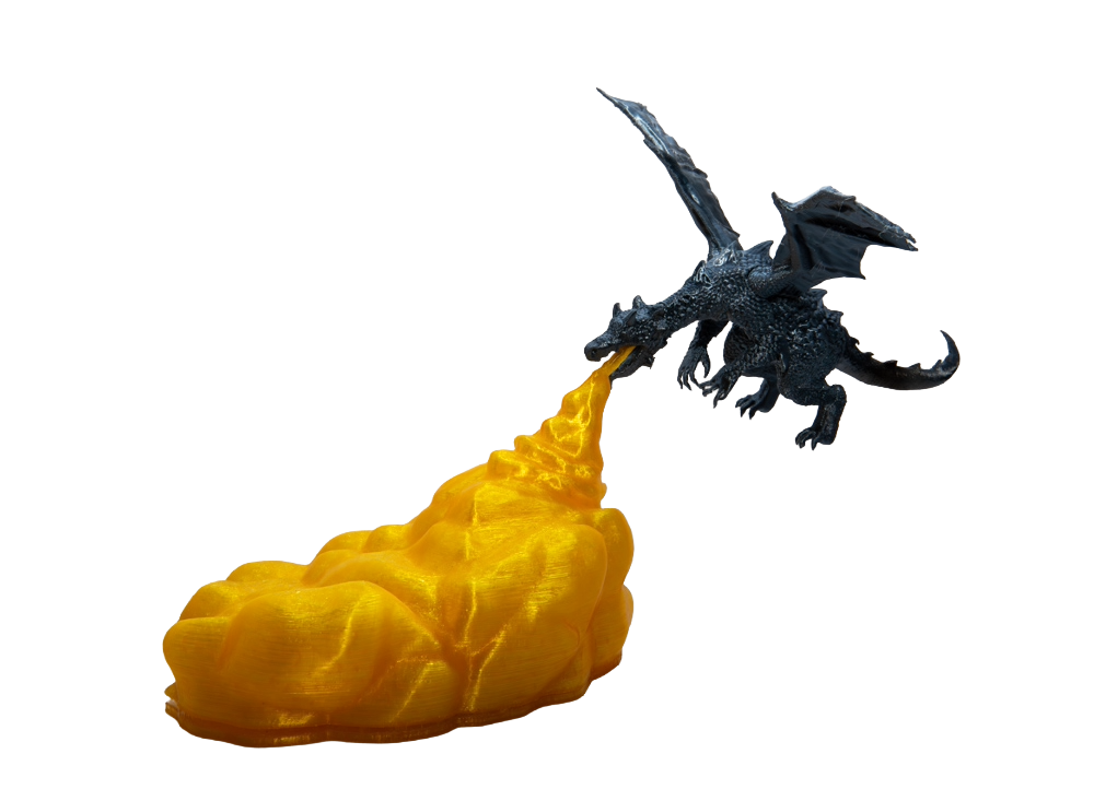 Luminária 3D de dragão cuspindo fogo em PETG translúcido, com LED integrado à chama. Peça robusta e de alto impacto.